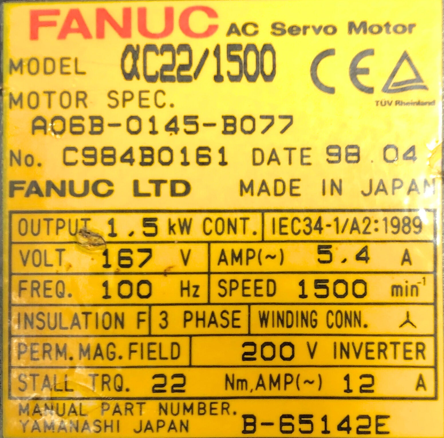 Fanuc AC Servo Motor AC22/1500 A8, 167V, 100Hz, 3PH, 5.7A