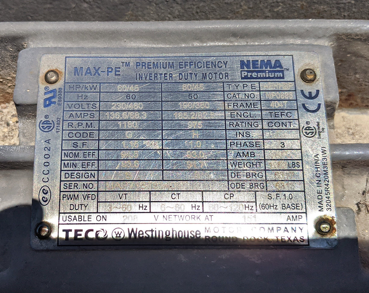 Teco-Westinghouse Motor Tag Info: