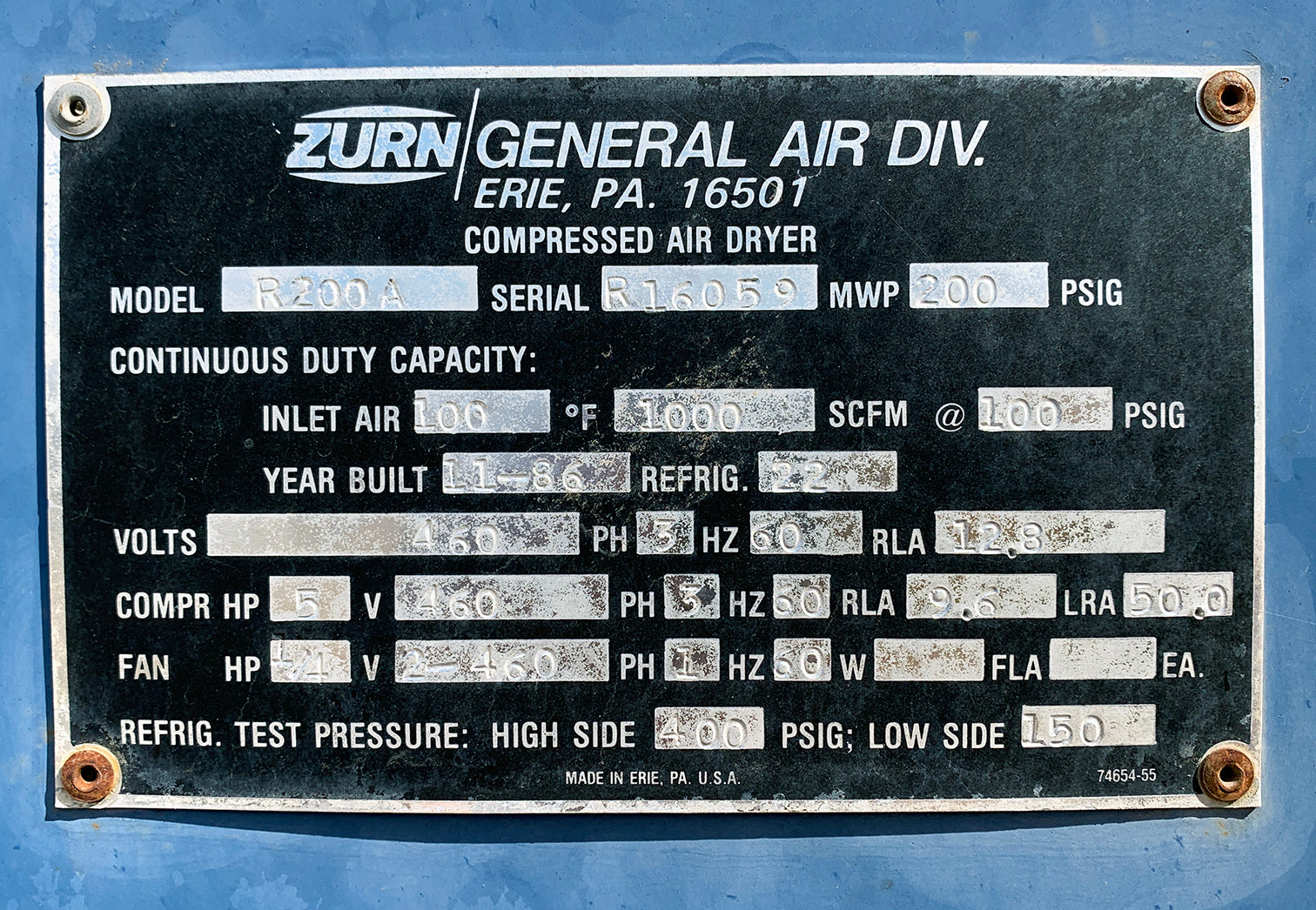 - Compr - HP: 5 | V: 460 | Ph: 3 | Hz: 60 | RLA: 9.6 | LRA: 50.0